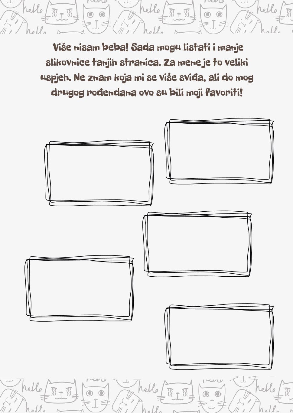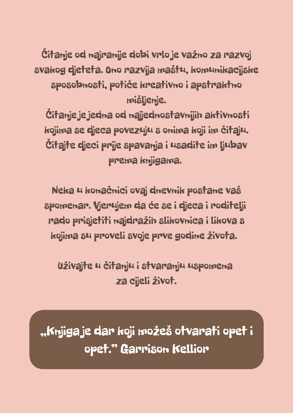 „Moj prvi dnevnik čitanja“ namijenjen je za korištenje od najranije dobi, točnije od rođenja djeteta do polaska u osnovnu školu. Ispunjeni dnevnik jednog će dana postati uspomena na najranije djetinjstvo i na sve slikovnice koje su vaša djeca voljela. Čitanje od najranije dobi izuzetno je važan dio za razvoj komunikacije, ali i za stvaranje povezanosti između djece i članova njihove obitelji.
